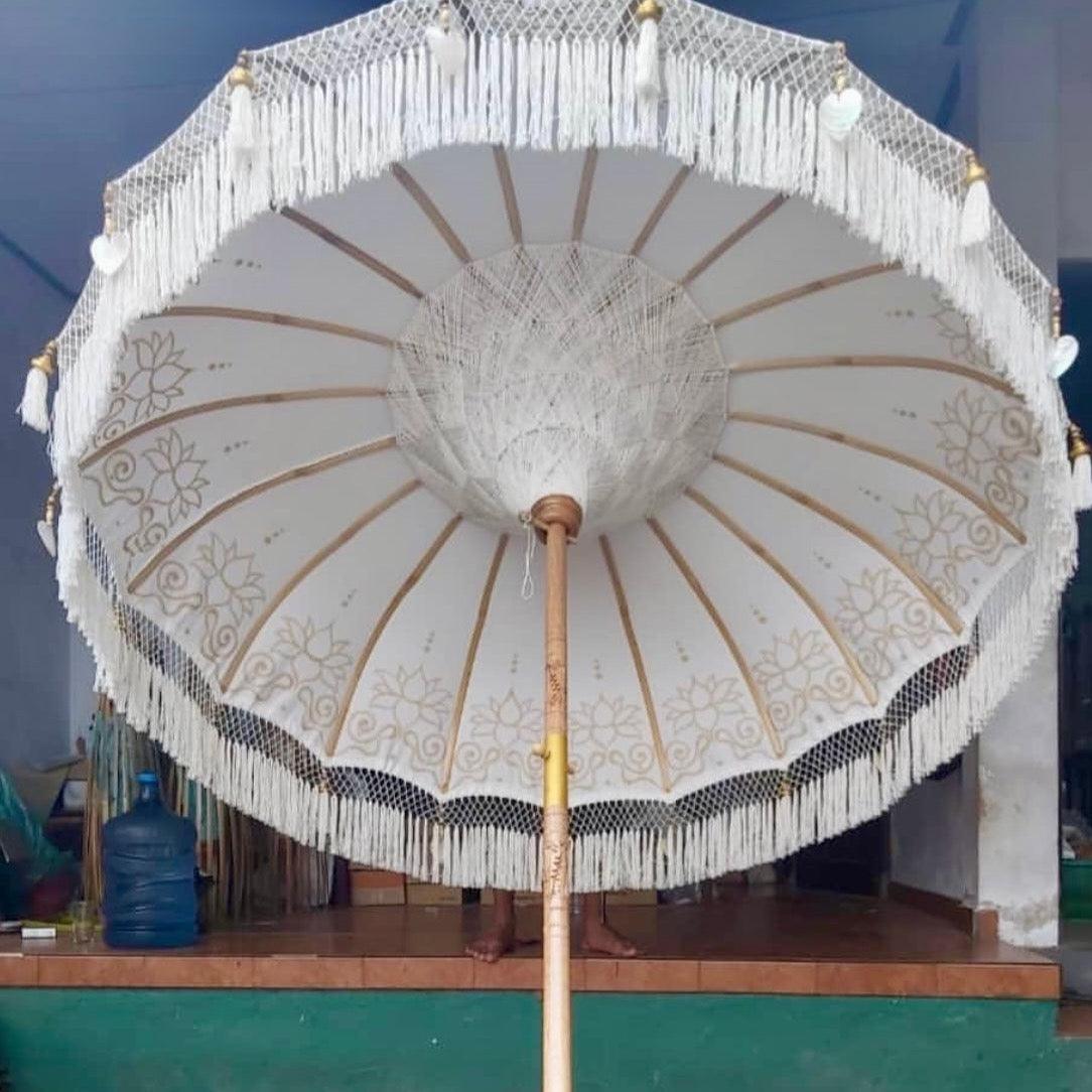 Moreover, the pole of the parasol is made from hand-carved durian wood, with white-painted details and a solid brass accent. Additionally, the foundation is secured by bamboo spokes, making it sturdy and reliable.