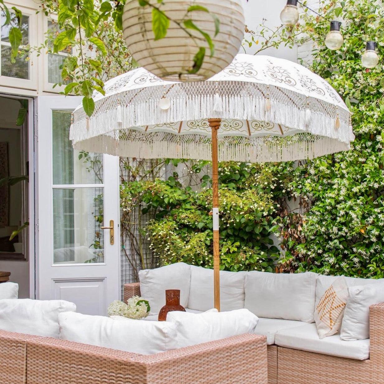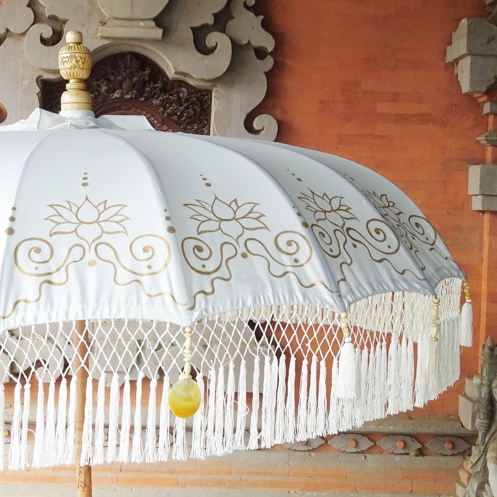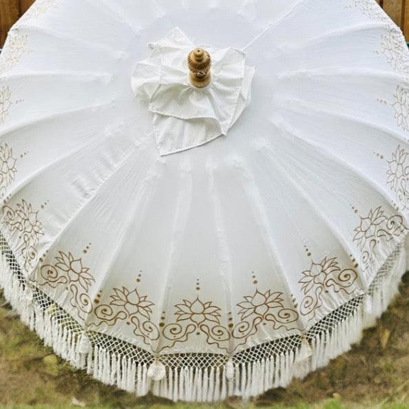 Our Parasol features a golden hand-painted design on white with an white inner threading and outer fringe. Adorned with white tassels, gold and wooden beading, and heart-shaped seashells, it is sure to add a touch of elegance to any space.