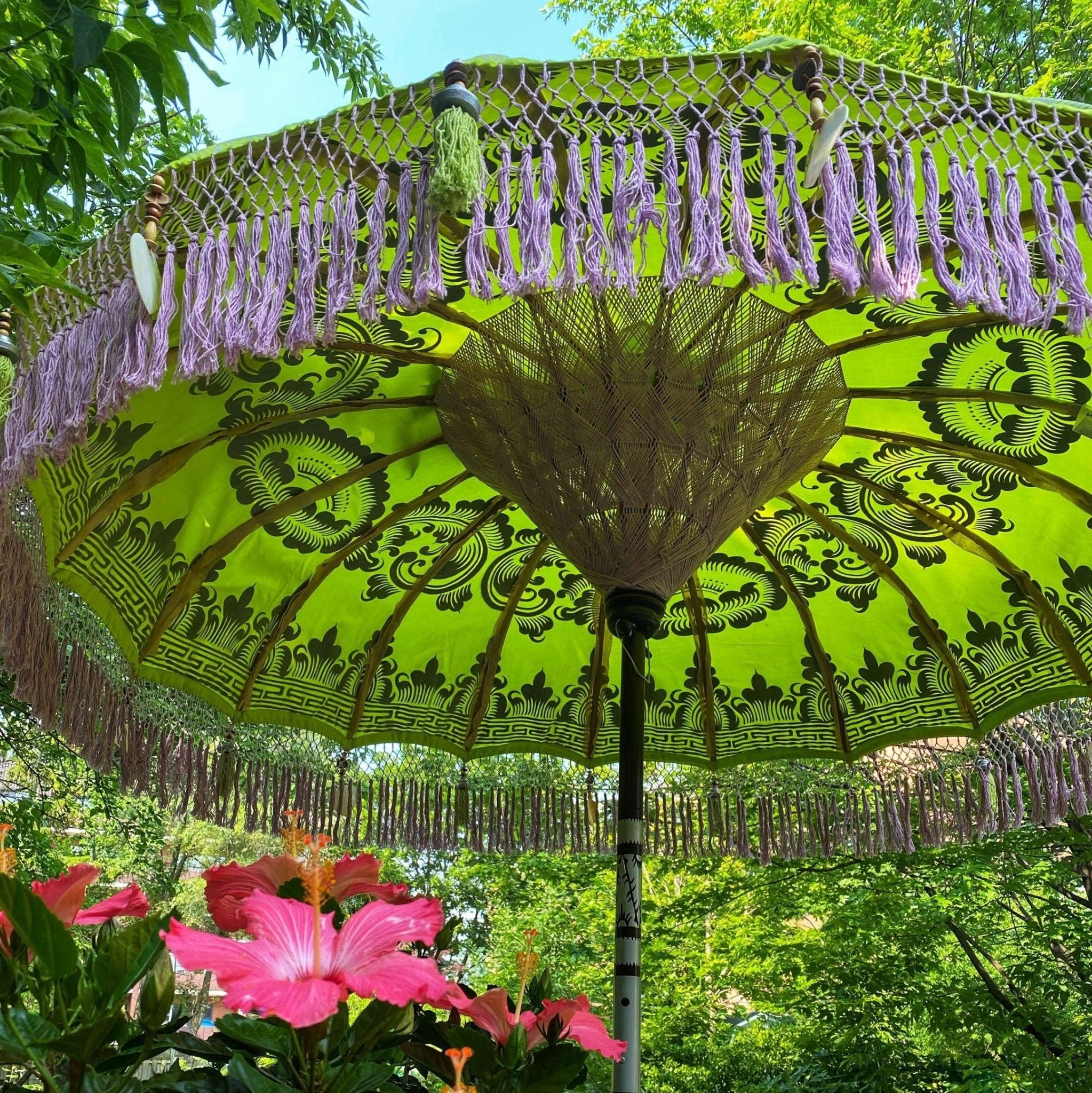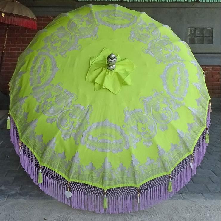 Introducing the Isabel Balinese Parasol - a stunning piece of art that will add a touch of tropical flair to your outdoor space. The parasol is handcrafted with the utmost attention to detail and features a vibrant lime green canvas with a silver hand-painted design that is sure to catch the eye. The lavender inner threading and outer fringe, adorned with lime green tassels, silver and wooden beading, and heart-shaped seashells, give it a unique and striking look.