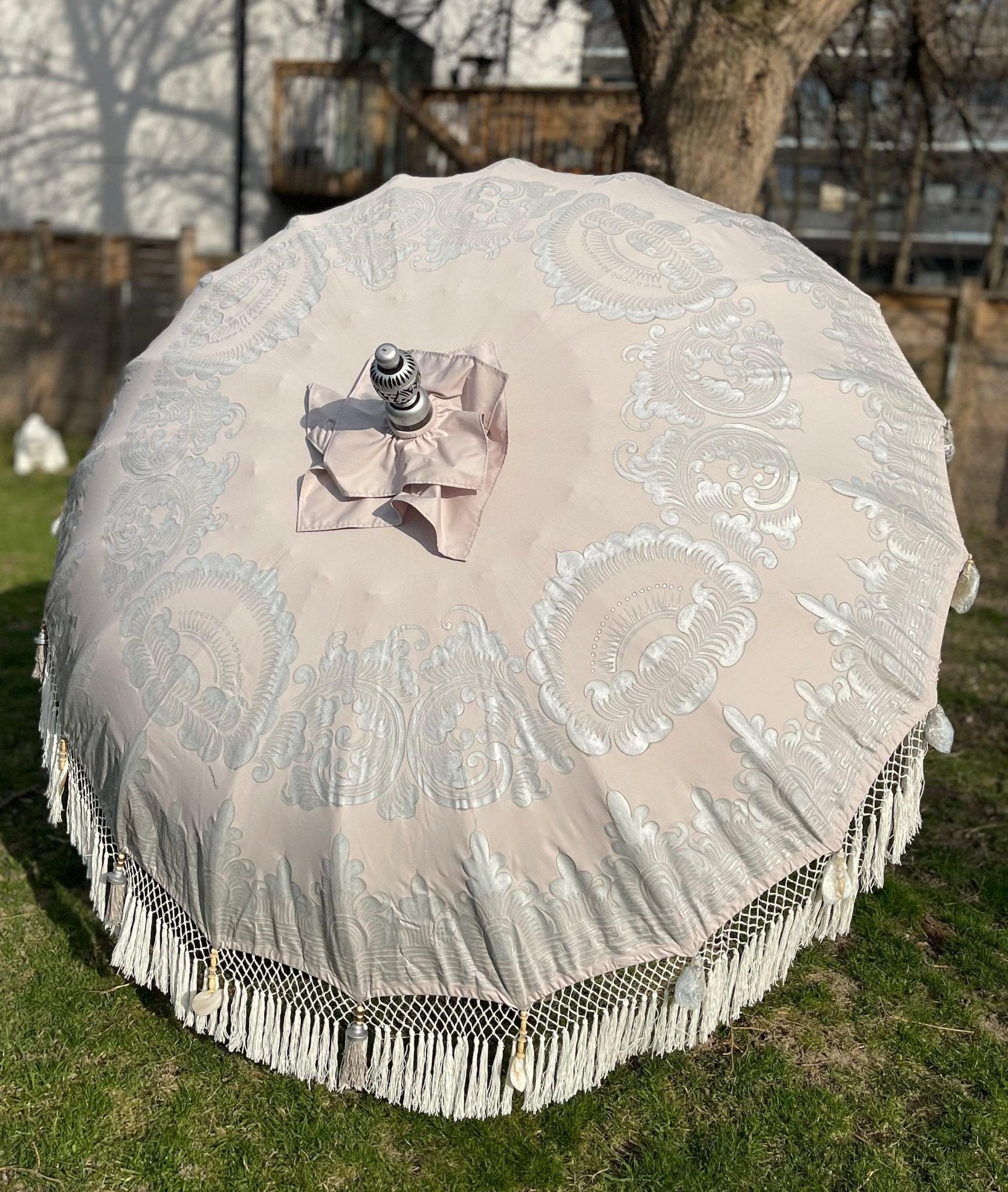Introducing the Sandy Parasol - a beautiful and elegant piece that will add a touch of tropical sophistication to your outdoor space. The parasol is expertly handcrafted with a silver hand-painted design on a light beige canvas, with white inner threading and outer fringe. The dark beige tassels, silver and wooden beading, and heart-shaped seashells give it a unique and striking look.