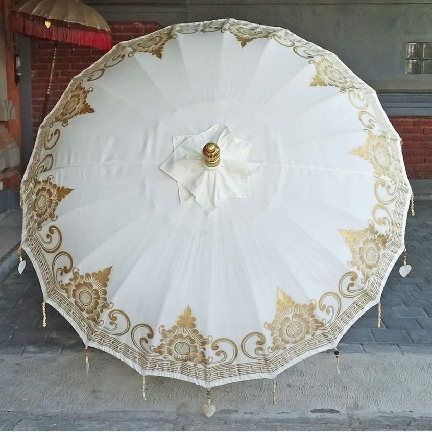 The pole is made from hand-carved durian wood with gold-painted details and a solid brass accent. White inner threading and bamboo spokes make up a secure foundation.