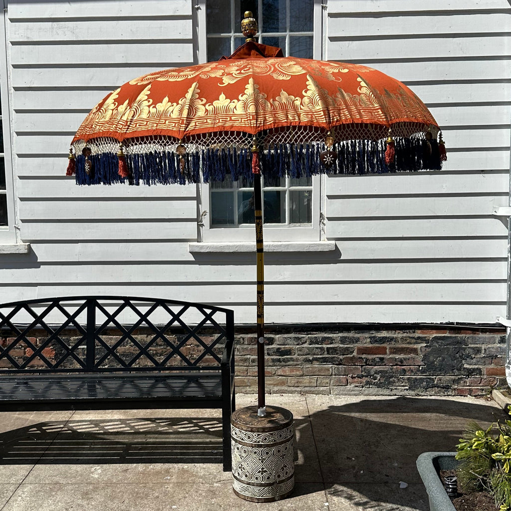 Introducing the Simon Parasol—a stunning fusion of traditional Balinese craftsmanship and modern luxury. This handcrafted garden umbrella is designed to elevate your outdoor space with exotic elegance and artistic detail.