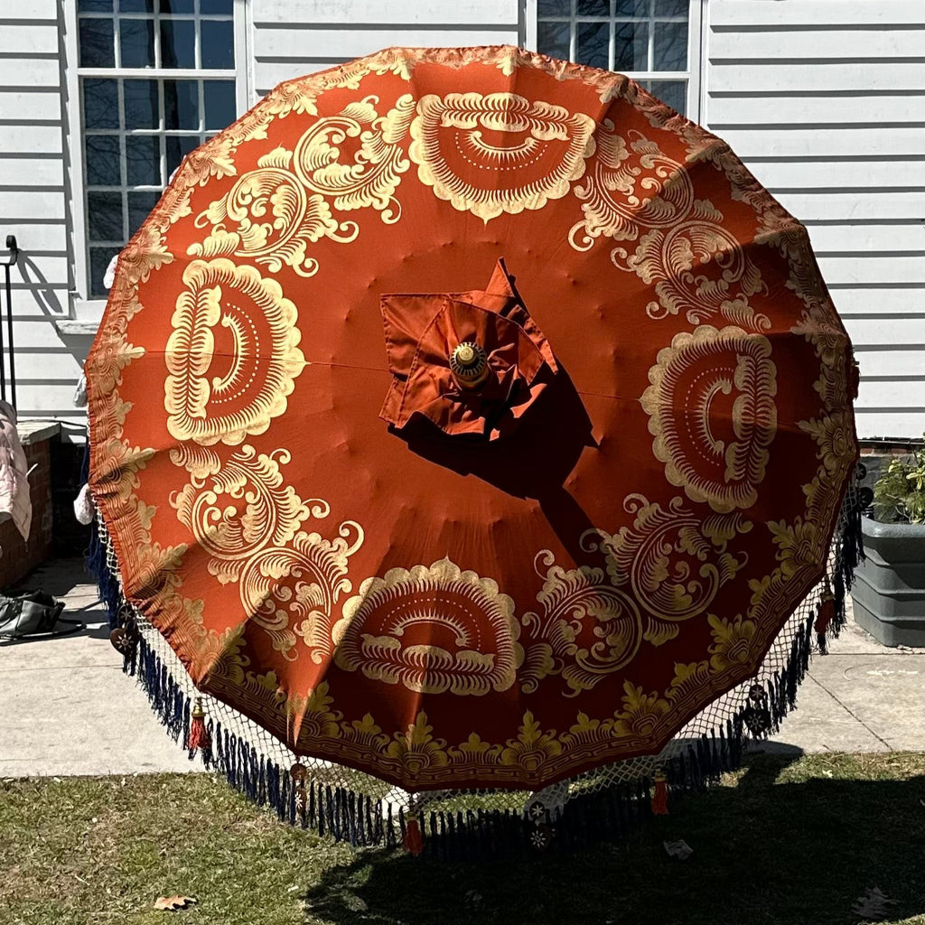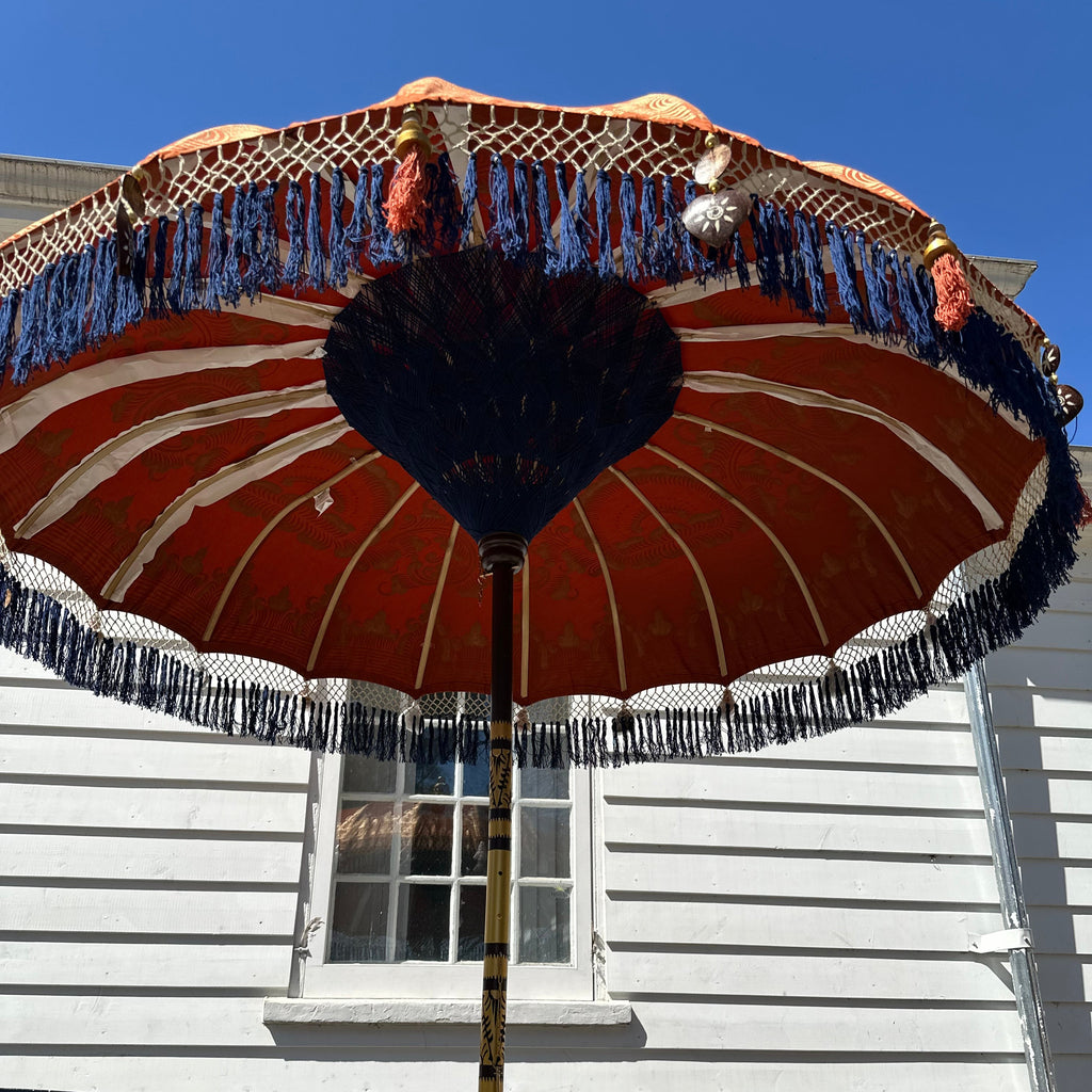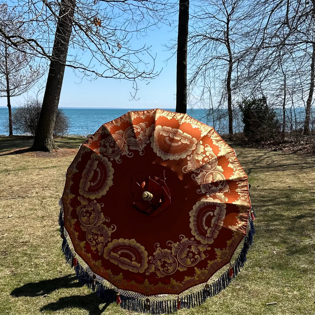 Crafted from finely carved bamboo, the parasol features intricate gold accents and a rich terracotta canopy adorned with hand-painted gold floral patterns. Vibrant blue fringes and delicate hanging ornaments add a playful, yet sophisticated touch, making it a true luxury outdoor umbrella.